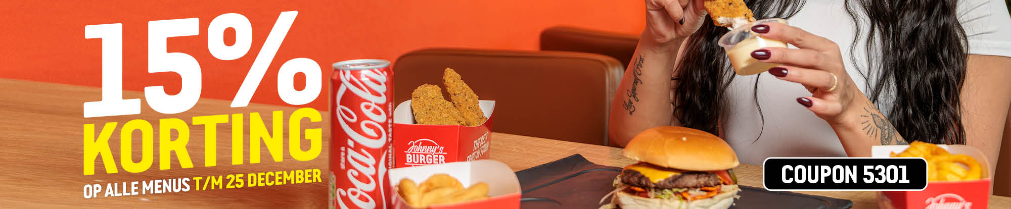 Classic burger met sla, tomaat en Johnny's saus, een drankje en een bijgerecht naar keuze